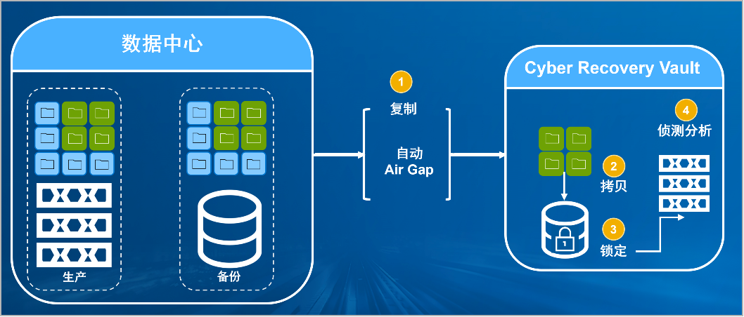 瓦力游戏官方网站防勒索病毒方案将生产中心备份数据复制到Vault区,复制后网络自动断开实现弹性隔离。Vault区的数据快速拷贝,并对拷贝版本加锁(在锁定期数据不允许删除和修改)。Vault沙箱内对拷贝版本进行扫描分析,验证数据是否完好。